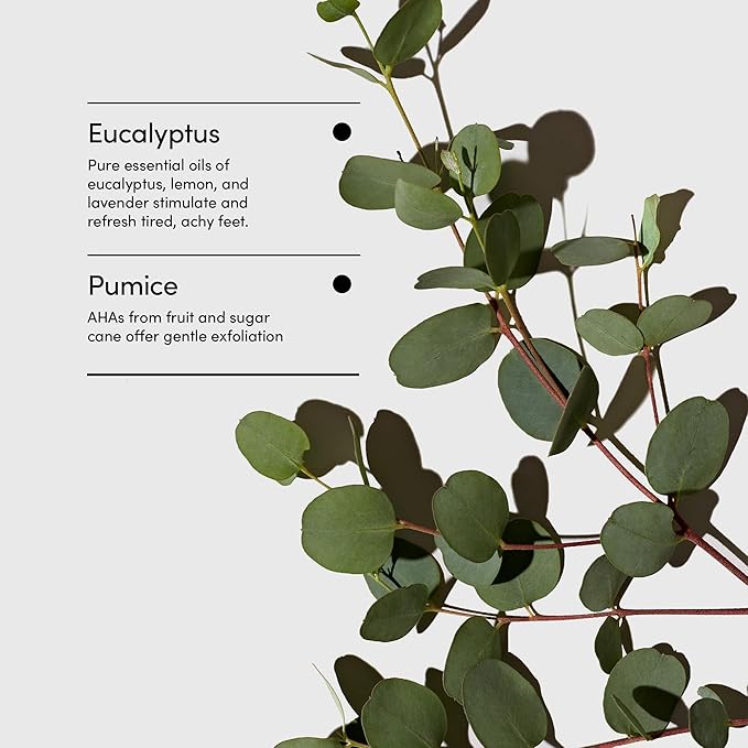 - FOOT SCRUB FOR SMOOTH, SOFT FEET: Exfoliating and foaming foot scrub with with granulated pumice that exfoliates; made with a blend of essential oils containing eucalyptus, lemon and lavender in a 4 oz jar