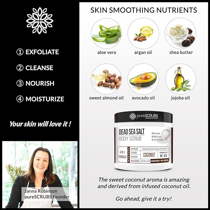 - GET ULTRA SMOOTH SKIN FAST - THIS WORKS! Our unique “4 in 1 Formula” does everything a body scrub should do and more - EXFOLIATE, CLEANSE, NOURISH & MOISTURIZE. Fine grain dead sea salt infused with essential oils, nutrients and skin softeners helps to smooth away rough, bumpy, and uneven textures to instantly reveal your true soft, healthy and radiant skin. You'll love the coconut aroma!
