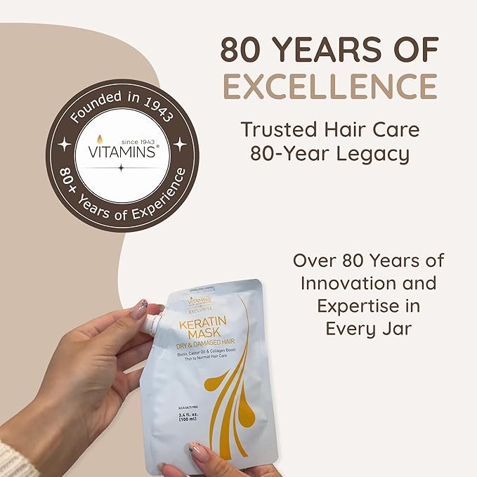 VITAMINS hair cosmetics Keratin Hair Mask - Deep Repair Conditioner with Biotin & Castor Oil - For Damaged, Dry, Curly, Straight, Thin & Fine Hair - Intense Collagen Protein Treatment
