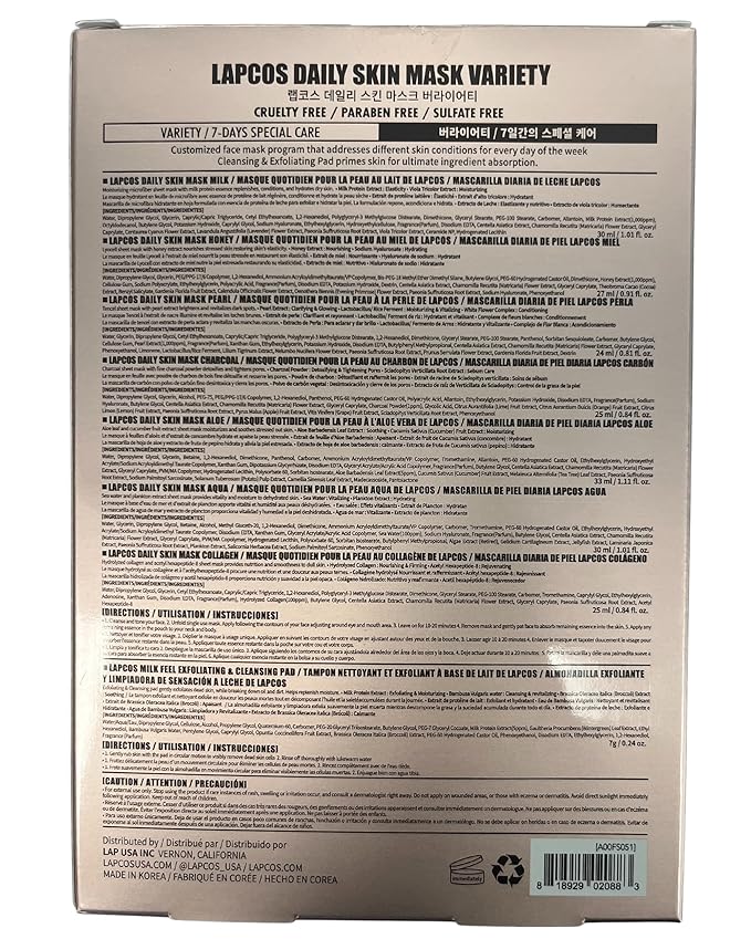 LAPCOS Daily Sheet Mask Variety Pack 7+1 (Version 1) Daily Face Masks - Hydrate, Clarify, Nourish, Exfoliate & Renew Skin, Korean Beauty Favorite (8 pack)