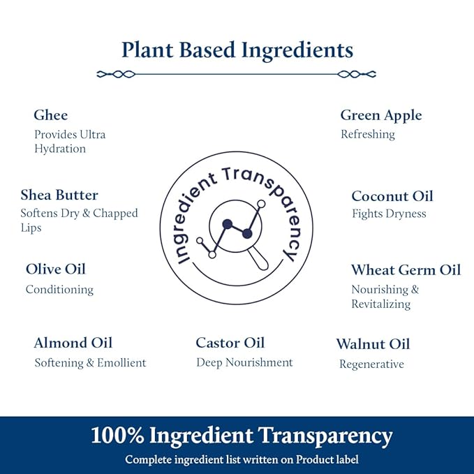 - WORKS AGAINST DRY CHAPPED LIPS: Richness of Green Apple extract and Ghee is known for its deep hydration properties. Contains Natural Vitamin C that helps in lips brightening and add gloss to it
