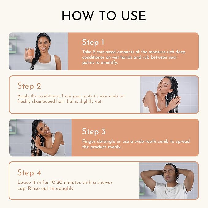 - HOW TO USE IT: Apply to clean, freshly shampooed hair that is damp/slightly wet. Rake in 2 coin-sized amounts of the deep conditioner from your root to your ends. Finger detangle, or use a wide-tooth comb to spread the product evenly. Leave it in for 10-20 minutes with a shower cap. Rinse out thoroughly. Enjoy hydrated, healed, & bouncy hair! Use up to once a week for chemically damaged curls and once in 2 weeks for normal hair.