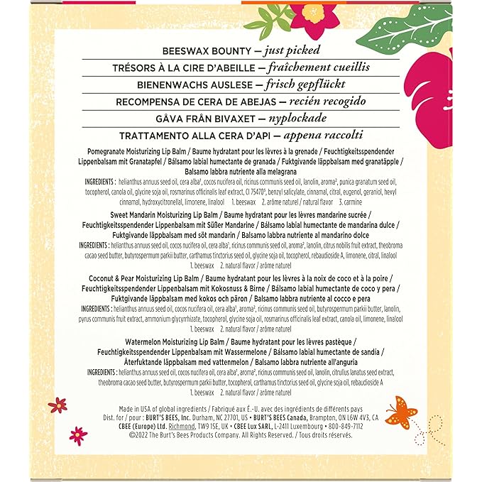 - MOISTURIZING GIFT SET: Everything you need for naturally beautiful lips, Burt's Bees Moisturizing Lip Balm comes in four flavors: Pomegranate, Sweet Mandarin, Coconut and Pear and Watermelon