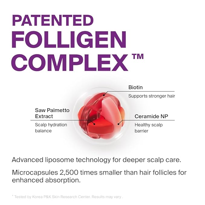 - Folligen Complex for Scalp Care and Hair Strengthening: Our patented Folligen Complex strengthens the scalp, improves its elasticity, and makes hair thicker and fuller. With a size 2,5000 times smaller than pores, active ingredients absorption is ensured for maximum efficiency