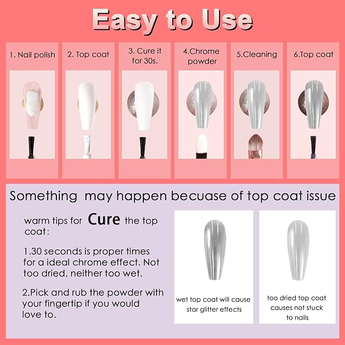 - Ultra Excellent Texture: The powder is fine and smooth without particles feeling, so you can make your nails exquisite with an amazing mirror effect. And the powder is non-toxic, more durable, and environmentally friendly, which does not harm your nails and skin, using it more at ease. Make mirror effects for your nails with our excellent equality chrome powder set.