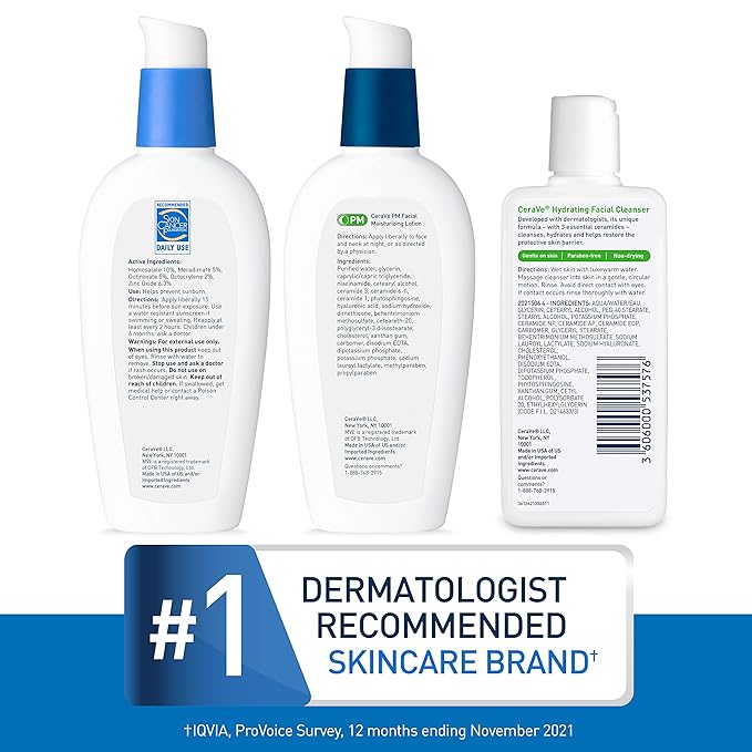 CeraVe AM Face Moisturizer with SPF, PM Face Moisturizer & Hydrating Face Wash Skin Care Routine for Morning & Night | Travel Size Toiletries | 3oz Lotion + 3oz Lotion + 3oz Cleanser