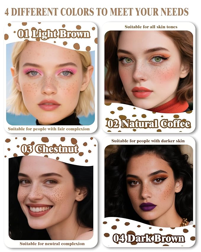 - Natural-Looking Freckles Any Time:Our 4-color freckle pen:01-Light Brown, 02-Natural Coffee, 03-Chestnut, 04-Dark Brown, matches all skin tones and hair colors. Easily achieve a sun-kissed look year-round, whether you have natural freckles or not. Perfect for adding vibrancy and personal flair to your daily makeup
