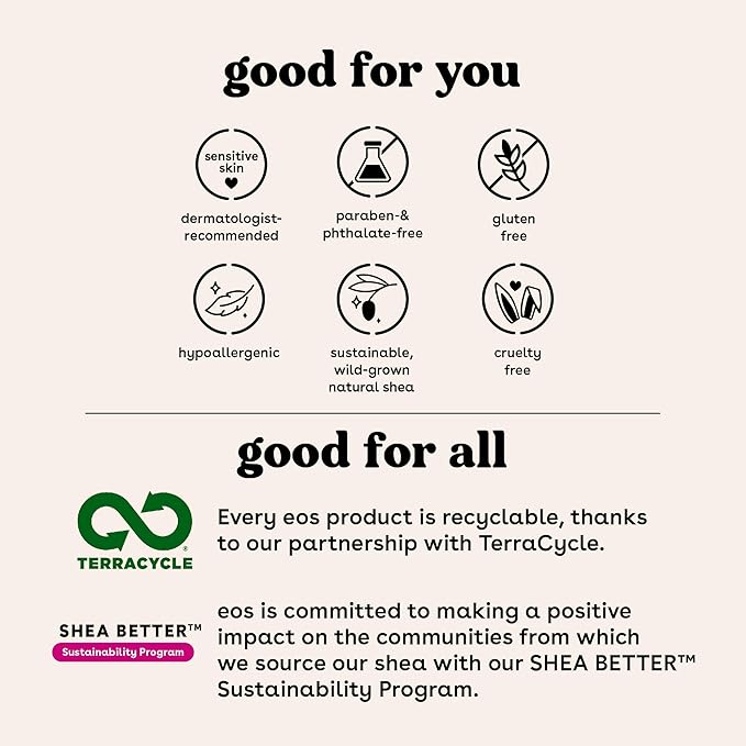 - SUSTAINBLY-SOURCED INGREDIENTS: eos lip balms have wild grown, sustainably sourced, natural shea butter and oil to leave your lips smooth and nourished