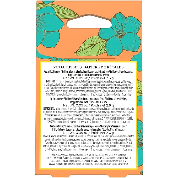 - BEAUTY GIFT SET: Pamper someone you love with a touch of luminescent color with Burt’s Bees Lip Shimmer for a natural everyday look in 3 flattering shades of Peony, Fig and Rhubarb