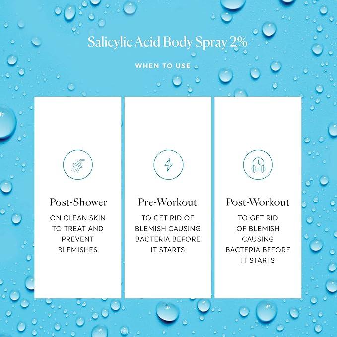 - ALL SKIN TYPES: Our Body Spray is safe for all skin types and tones, plus alcohol-free. Use post-shower, pre-workout, post-workout to treat and prevent blemishes. Spray a uniform layer on the affected area. A patch test is advised prior to use