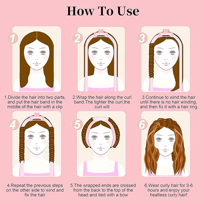- Easy to Use & Tips---1. Lightly damp your hair or drying your hair to slightly damp after shower 2. Fix the middle part of the curling iron on the top of the head with a bobby pin. 3. Wrap the hair on both sides around the curling iron respectively. When the hair is braided to the end, secure it with a hair tie. 4. Cross the two ends of the hair band behind the head, tie a knot in front of the hairpin on the top of the head, and remove the hairpin. TIPS: Spary with styling to last longer.