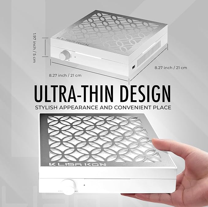 - Less occupancy & additional USB Port: The size of nail tech dust collector is super compact. Dust Collector for nails does not occupy the whole nail table. The wide dust collecting area provides perfect nail dust adsorption without residue. Perfect size for any nail station. Unique and modern design for maximum versatility. With its compact shape and minimal footprint, valuable desk space is also free. With the USB charging port, you can charge or connect your accessories effortlessly.