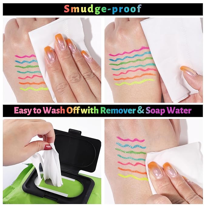 - [Multi-Use] The vivid colored eyeliner set not only can be used as eyeliner pencil, but also can use as eyeshadow, face and body paint, you can do your own art & craft on many occasions as light up accessories and glow party supplies. Versatile design saves storage space and time of makeup for traveling. Easy to remove-all you need is makeup remover, cotton pad, soap and warm water.