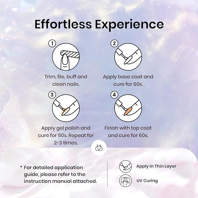 - Easy Application and Long lasting: Gel polish is long lasting for 21+ days with perfect shine under proper application - With base gel top coat under the full application Process. Highly recommend a minimum of 60-120 seconds with a Uv Led light.