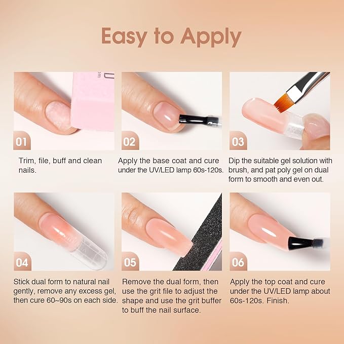 - Warm Tips: It is common for gels to be sticky. so dipping you brush into the gel solution will help you push the gel more smoothly. Or you can seal the gel tube and soak it in warm water before use, which will make it more fluid and help you squeeze out the poly nai gel more smoothly. Both sides of the nail need LED light or UV light to cure for about 120s to completely dry. The lighting time needed depends on the thickness of the gel.