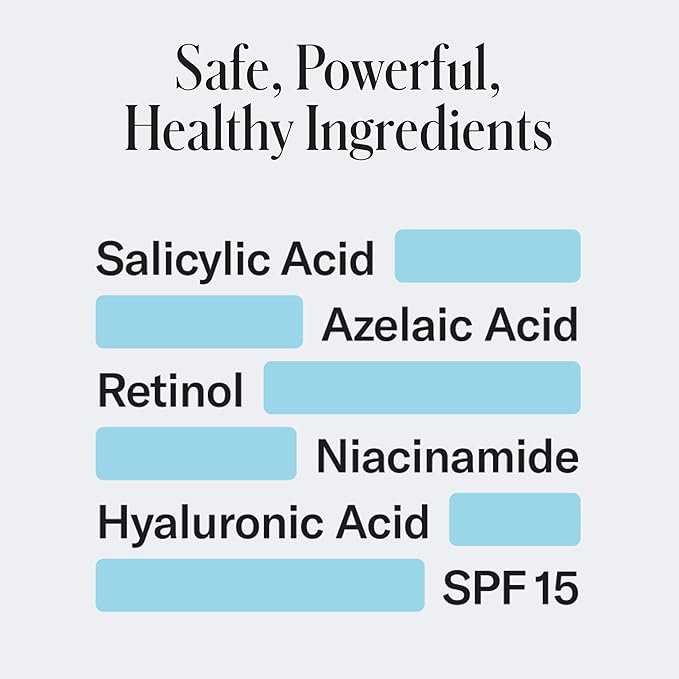 - SAFE, POWERFUL, HEALTHY INGREDIENTS: No Benzoyl Peroxide. A dermatologist-tested formula including Salicylic Acid, Azelaic Acid, Hyaluronic Acid, Niacinamide, and increasing level of Retinol will help prevent new breakouts and heal acne scarring.