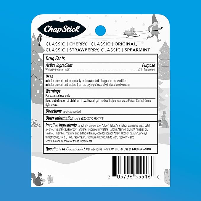 - One box of the Chapstick Classic Collection Lip Balm Holiday Gift Set with Classic Original, Spearmint, Cherry and Strawberry Lip Balm Tubes includes five 0.15-ounce lip balms perfect for holiday gifting