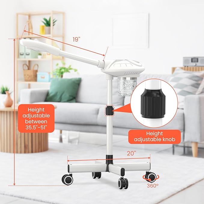 - Rolling Design:The standing facial steamer Equipped with free-moving wheels, it is easy to move and suitable for various locations such as homes and salons. Whether at home or in a beauty salon, it can be easily moved to the desired position, making it more flexible and convenient to use.