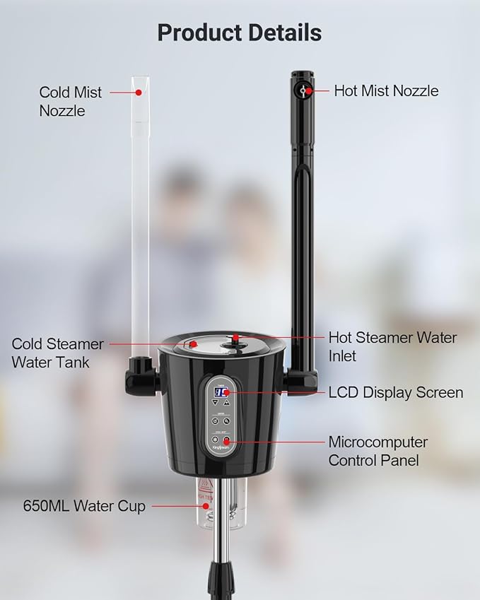 - [Practical & Easy-to-Use Design] The Kingsteam facial steamer features a 360Β° rotating nozzle, adjustable arm, and height-adjustable mobile stand with a telescopic tube, designed to accommodate your different needs and settings. Whether sitting or lying down, you can easily enjoy spa treatments for your face and neck. The detachable water cup is simple to clean, and we recommend changing the water regularly for optimal performance. The stable, mobile stand with wheels allows for easy movement and secure positioning