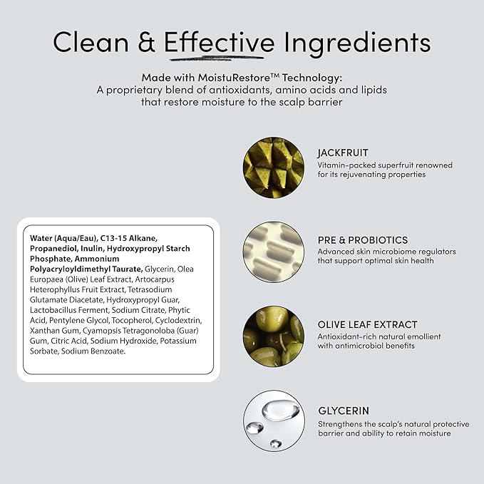 - Infused with Nature-Powered Ingredients: Includes Jackfruit (rich in antioxidants and vitamins to rejuvenate skin), Olive Leaf Extract, Pre & Probiotics (to balance the scalp’s microbiome), and Glycerin (to lock in moisture and strengthen the scalp's protective barrier).