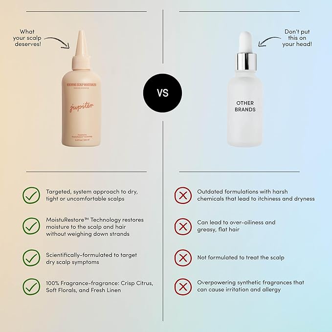 - Renewing Scalp Moisturizer vs. Restoring Serum - The Key Difference: Jupiter’s Renewing Scalp Moisturizer is specially designed to hydrate and strengthen dry scalps, featuring Aloe Vera and B-vitamins for a smoother, healthier scalp and hair. In contrast, the Restoring Serum is a medicated treatment with Zinc Pyrithione, targeting dandruff and flaking.