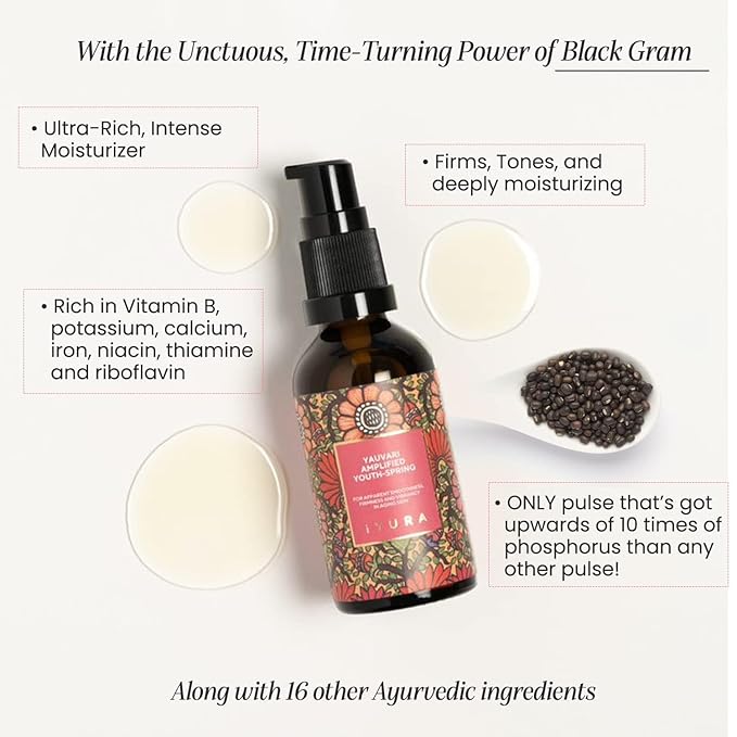 - FIRMING MOISTURIZER FOR FACE, NECK AND DECOLLETE: Smooth the look of wrinkles, fine lines, sagginess and other signs of aging, and get firmer, youthful skin. Yauvari Oil is made with protein-rich Black Gram that is known for its unctuous nature and toning action. It has over 16 Ayurvedic ingredients including Turmeric, Vetiver and Vitamin-rich Oils that leave you with youthful radiance.