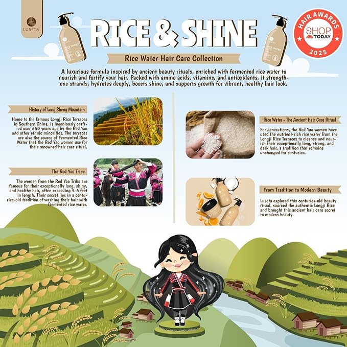 - Ancient Rituals, Radiant Hair: Inspired by traditional Asian haircare rituals, our Rice Water Shampoo and conditioner set harnesses the power of fermented rice water to strengthen, hydrate, and revitalize hair. Experience silky, resilient strands with a natural shine and effortless softness.