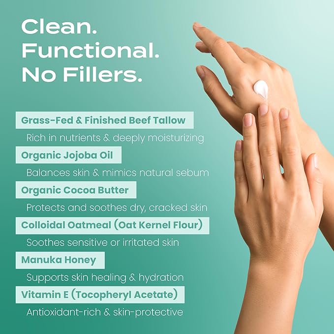 - Beef Tallow Balm With Manuka Honey: Formulated for women and men, our beef tallow balm is enriched with Manuka honey to deliver hydration and healing. This unique blend locks in moisture, soothes dry cracked skin, and supports the skin barrier.