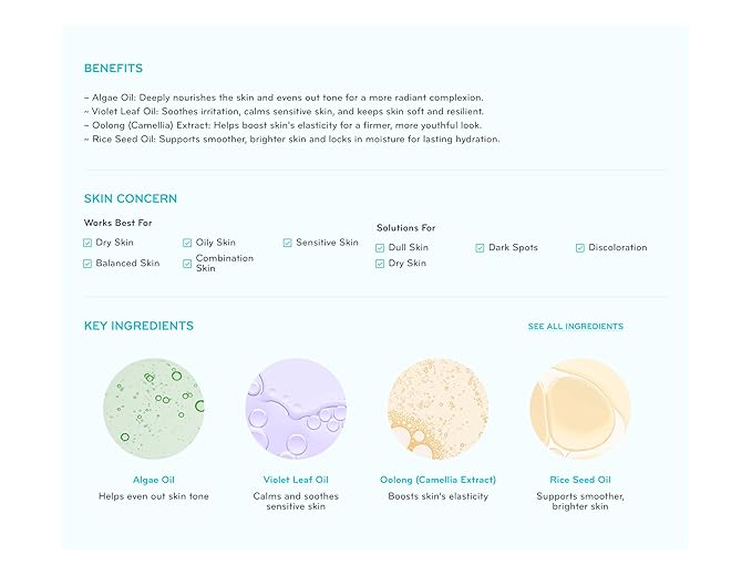 - Hydrating Glow Booster - This lightweight facial oil deeply nourishes and smooths skin using algae oil to even tone and enhance radiance for all skin types.