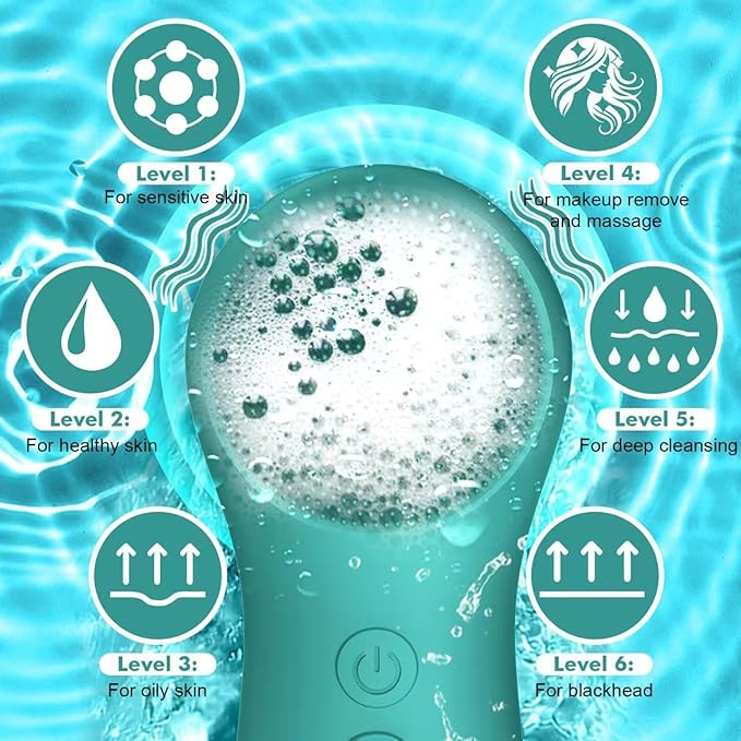 - 6-Speed Smart Silicone Face Scrubber: This portable silicone facial brush offers 6 adjustable intensities to meet all skincare needs—whether you have sensitive, dry, combination, or oily skin.Our face brush delivering 5x deeper cleansing than manual methods, silicone brush minimizes enlarged pores and evens skin tone. Facial scrubber fixed-head design not rotation, preventing the tugging and irritation associated with traditional brushes.