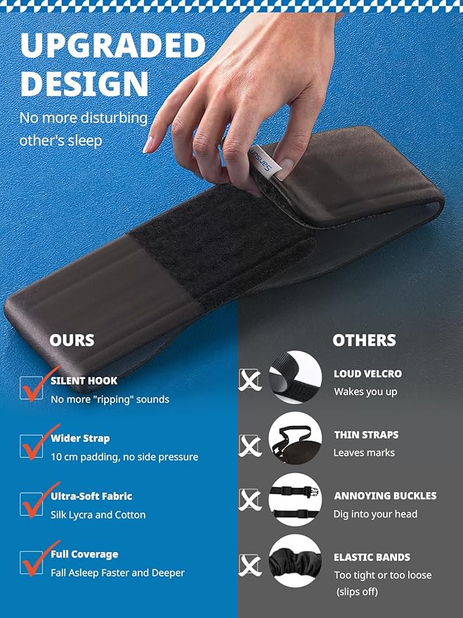 - Wider Adjustable Strap – Stays Put in Any Sleeping Position: Designed for ultimate stability and comfort. The soft, wide strap hugs your head securely without slipping or squeezing, even when you sleep on your side.