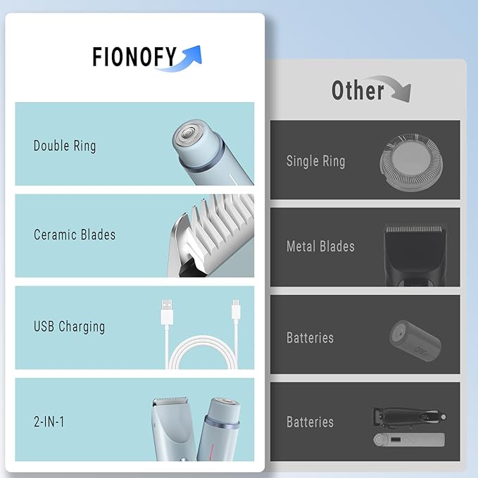 - 【2-in-1 Bikini Trimmer & Body Shaver for Women】The FIONOFY bikini trimmer for women is a versatile electric razor featuring dual professional heads. The body shaver smoothly trims arms, legs, and bikini zones, while the facial head delicately removes fuzz from cheeks, chin, and upper lips – making it the ultimate trimmer for women seeking full-body grooming.